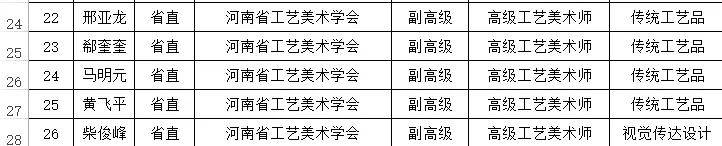 根据全省职称工作安排,通过个人申报、单位推荐、主管部门或省辖市人力资源社会保障行政部门资格审查、评委会承办部门复核,经河南省工艺美术专业人员高级职称评审委员会组织专家评审,26名同志通过评审。现将评审通过人员公示如下,请予监督。如对公示人员有问题反映,请于公示期以书面形式反馈我们。