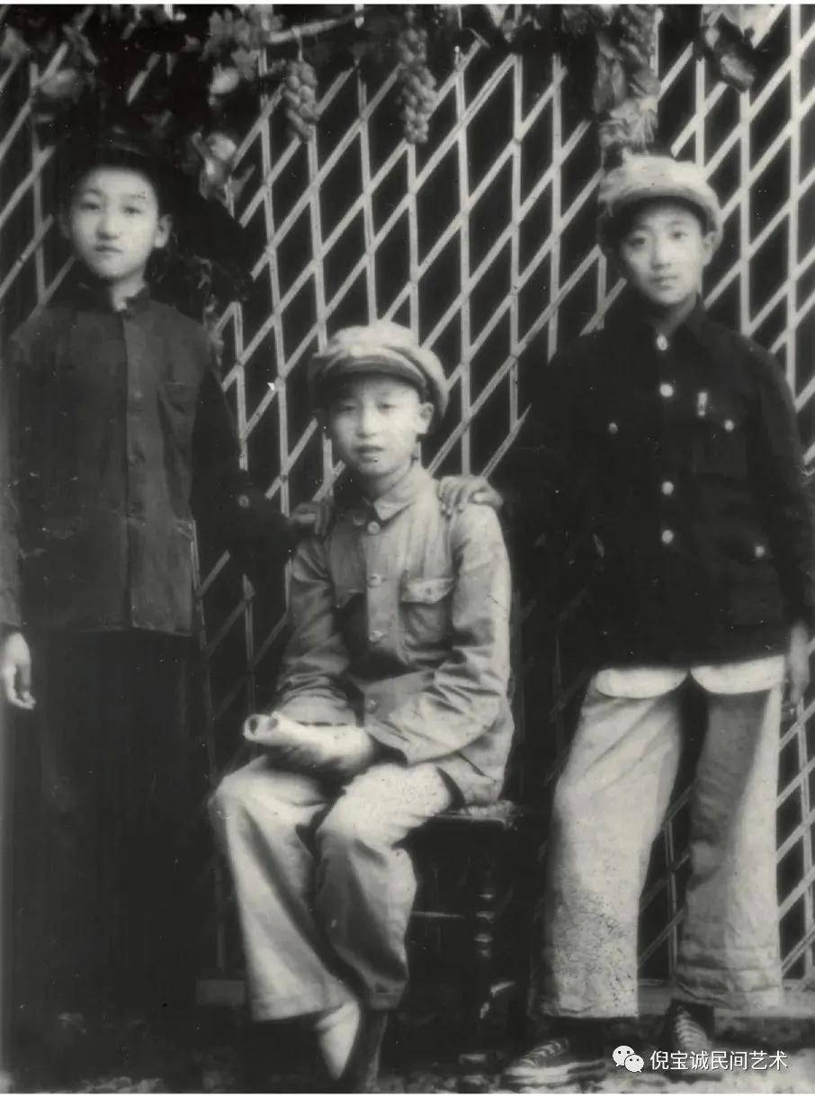 1947年12岁时在河北省宣化县私立景星小学就读六年级时与要好的同学郭德臣、张某某合影(左一为倪宝诚)