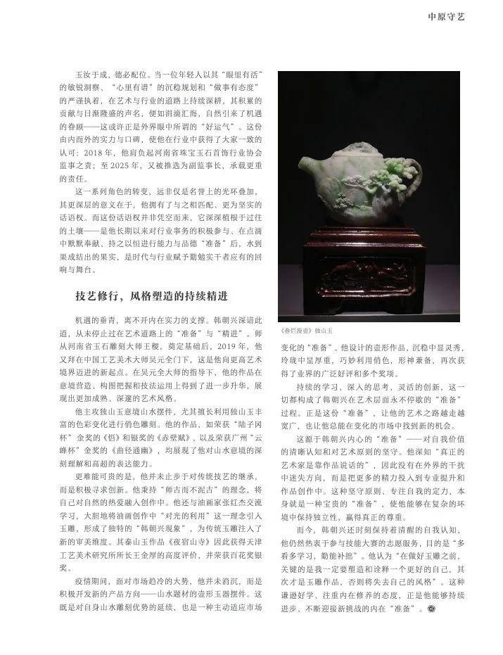 1986年,韩朝兴出生于镇平县的一普通农家。虽自幼在玉雕氛围中耳濡目染,但在成长初期,一度感到“无依无靠,前途渺茫”。然而,迷茫并未让他停止脚步,对家乡山水的天然亲近,对玉石雕刻的耳濡目染,构成了他日后选择山水题材、投身玉雕事业的最初底色。