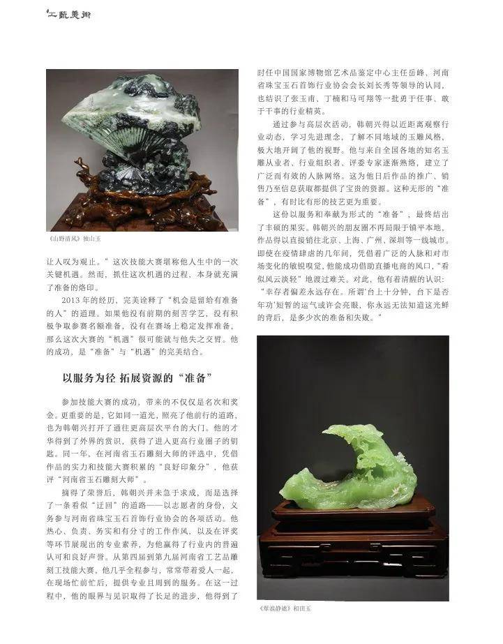 回头来看,这是韩朝兴在为未来所做的技能储备,在机会尚未来临之时,他专注于提升自身的核心竞争力。这份储备是扎实的绘画功底,是对独山玉特性的深入把握,是对传统技艺的熟练掌握,是对现代审美的初步探索。这份准备,在当时并未显现出立竿见影的效果,直到他参加了一次技能大赛,这些“准备”才显示出威力。