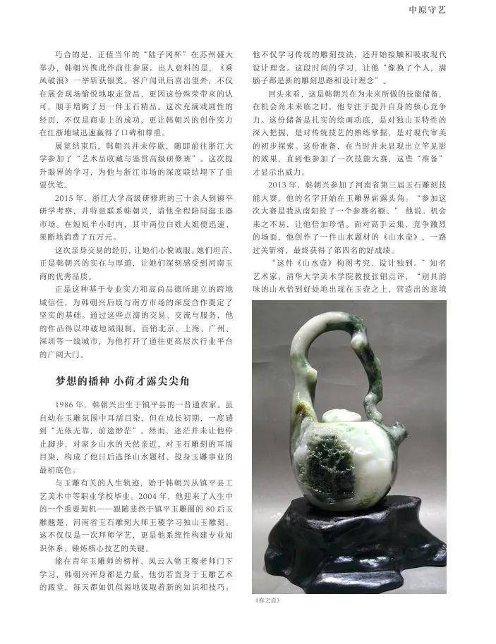 2013年,韩朝兴参加了河南省第三届玉石雕刻技能大赛,他的名字开始在玉雕界崭露头角。“参加这次大赛是我从南阳捡了一个参赛名额。”他说。机会来之不易,让他倍加珍惜。面对高手云集、竞争激烈的场面,他创作了一件山水题材的《山水壶》,一路过关斩将,最终获得了第四名的好成绩。