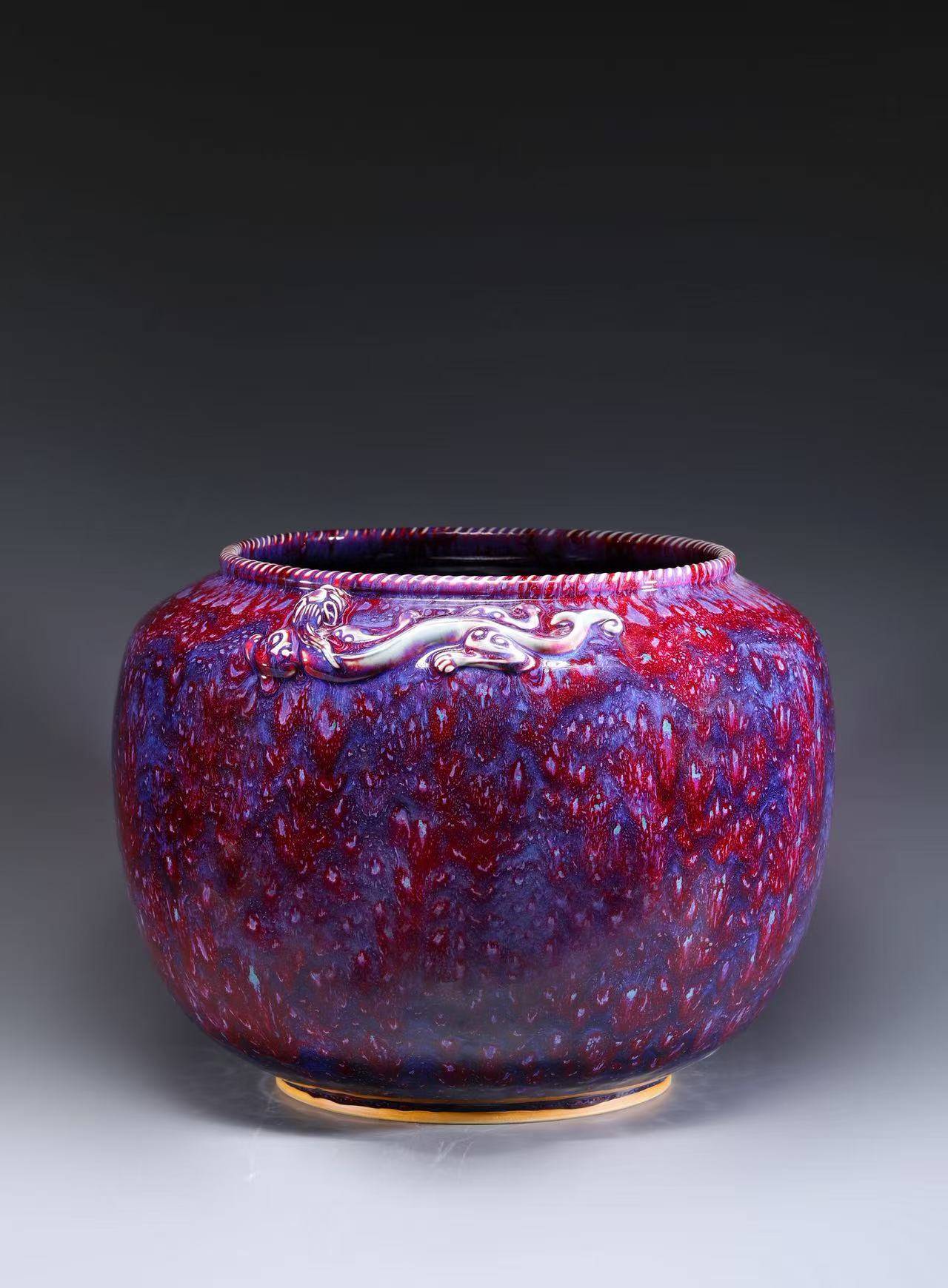 例如他的金奖作品《益寿画缸》和《盛世饕餮鼓钉尊》,器表往往不仅是单一的红或蓝,而是红里透紫、紫中藏青,色彩的过渡自然而富有层次 4。他利用釉层的厚度差异,让器物的棱角处呈现出“出筋”的古铜色,与腹部绚烂的窑变色形成虚实对比。这种处理手法,使得他的作品既有金属的质感,又有玉石的温润,完美诠释了钧瓷“黄金有价钧无价”的艺术价值。