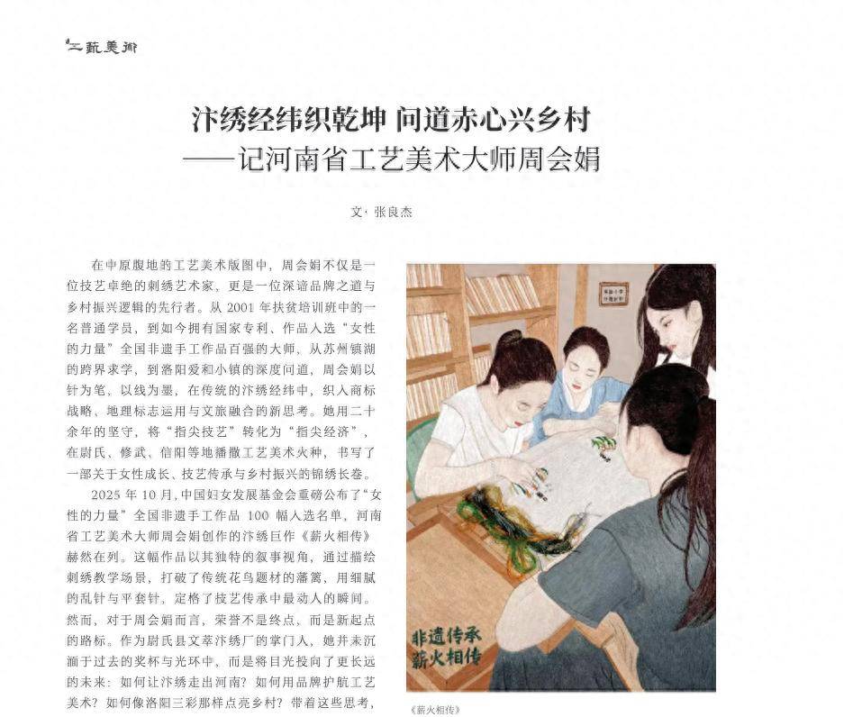 刊登周会娟事迹《浙江工艺美术》页面在中原腹地的工艺美术版图中,周会娟不仅是一位技艺卓绝的刺绣艺术家,更是一位深谙品牌之道与乡村振兴逻辑的先行者。从2001年扶贫培训班中的一名普通学员,到如今拥有国家专利、荣获“女性的力量”全国工艺美术百强的大师