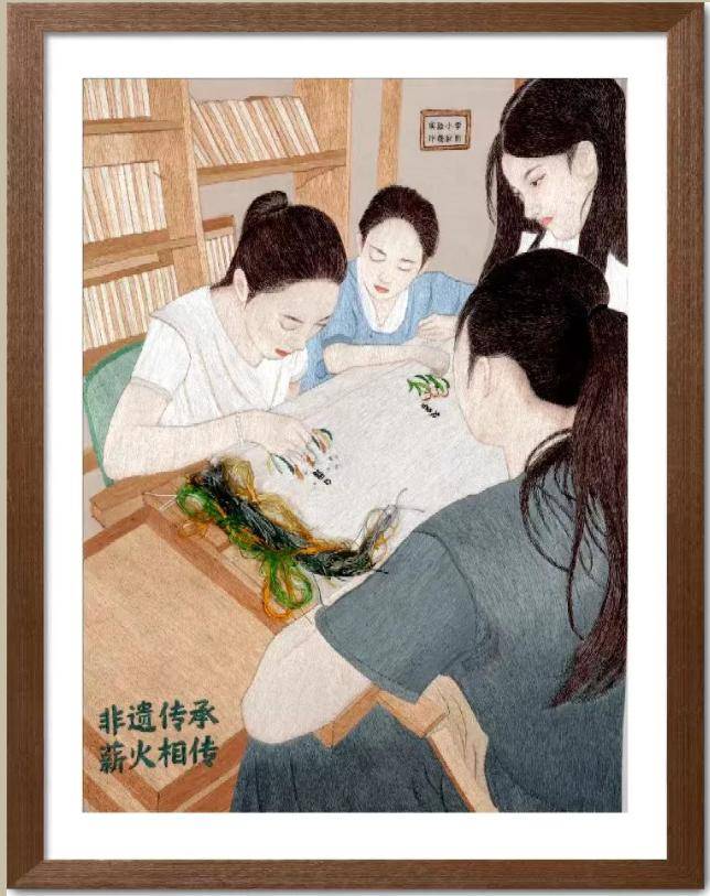 五年的刻苦学艺,周会娟在韩老师的指导下打下了坚实的童子功。但她并未止步于此。在恩师的推荐与鼓励下,周会娟做出了一个大胆的决定:南下苏州。苏州镇湖,被誉为“刺绣之乡”,那是苏绣的圣地。作为一个北方绣娘,周会娟怀揣着一种“找差距”的执着,只身闯入江南烟雨。在镇湖的两年,是她艺术生涯的“熔炉期”。她师从高级工艺美术师、苏绣大师王建琴,如饥似渴地探寻苏绣与汴绣的异同。她不再局限于模仿,而是尝试将苏绣的“平、齐、细、密、和、光、顺、匀”融入汴绣的粗犷豪放之中。从花鸟的灵动到风景的深远,再到人物神韵的刻画,她挨个学了个遍。这段“南游”经历,让她积累了极具张力的艺术语言,也为她日后创作出《薪火相传》这样兼具写实与写意、融合南北技法的佳作奠定了底色。