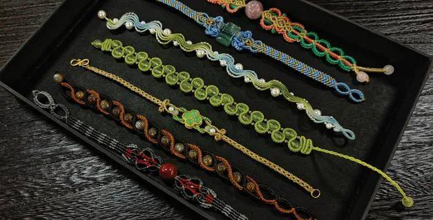 赵夏楠初遇非遗编绳,便被其深深吸引。不同造型的绳结更是蕴含着不同寓意:平结简洁大方,寓意着平安顺遂;双钱结形似双钱,象征着财富盈门。每一个绳结的穿梭,都像是在书写一段无字的祝福寄语。她怀着对传统技艺的敬畏之心,四处寻访编绳老师,虚心求教技法;或在网络寻找教程,认真研究工艺。从最基础的绳结编织,到复杂的图案创作,她一步一个脚印,不断钻研探索。每一件作品都像是她精心雕琢的艺术品,既保留了非遗编绳的传统韵味,又融入了现代时尚元素,让人眼前一亮。